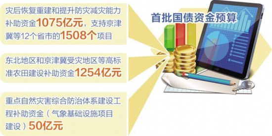 首批国债资金预算中,灾后恢复重建和提升防灾减灾能力补助资金1075亿元、东北地区和京津冀受灾地区等高标准农田建设补助资金1254亿元、重点自然灾害综合防治体系建设工程补助资金(气象基础设施项目建设)50亿元。