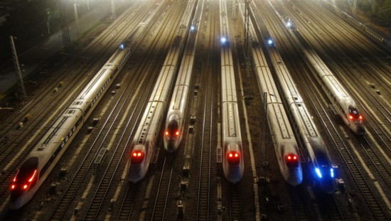 1月26日凌晨,动车组列车停靠在广州动车段的存车线上(无人机照片)。新华社记者 邓华 摄