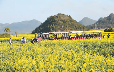 近日,在云南省曲靖市罗平县金鸡峰丛景区,近百万亩油菜花相继绽放,吸引众多游客前来踏青赏花。